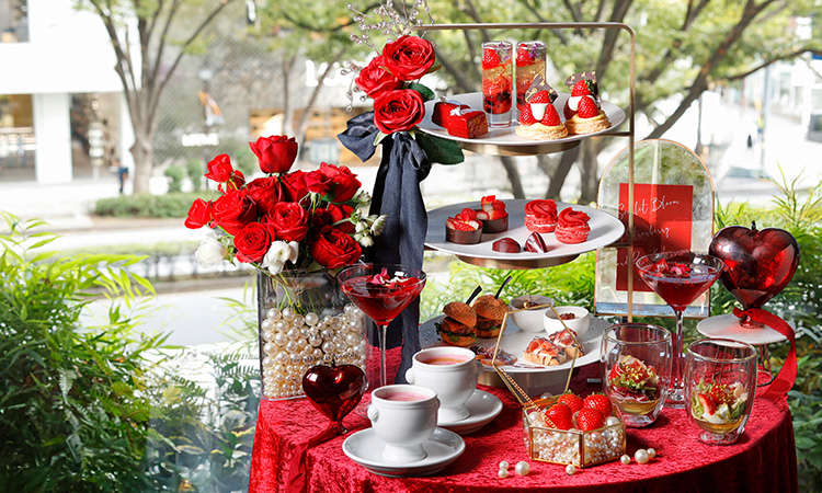 真っ赤に艶めくチョコレートムース、ローズをかたどったマカロンなど6種類がスタンドを彩ります。