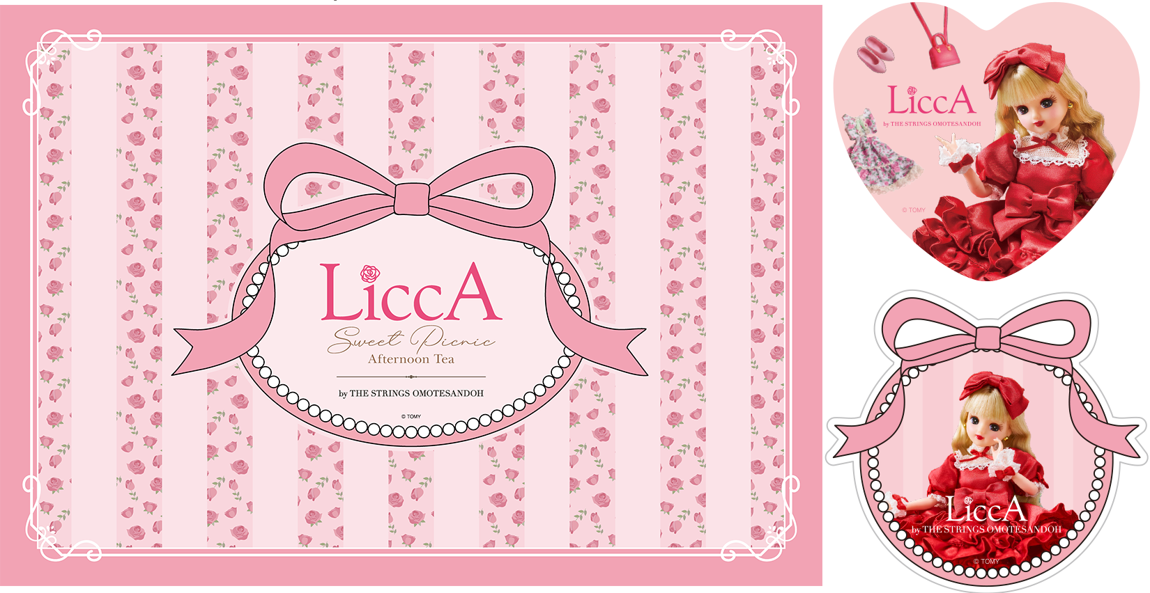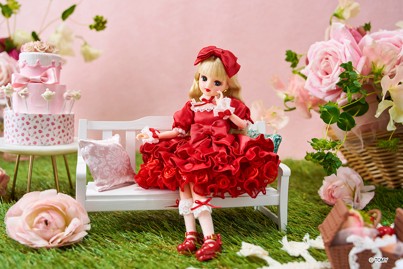 本コラボレーションにて特別に誕生した、オリジナル『ストリングスリカちゃん』。アフタヌーンティーのコンセプトである“Sweet Picnic”の世界観を映しとったような装いは、目を惹く真っ赤なドレスに、存在感のある大きなリボンやローズのモチーフをあしらったスタイル。ファッショナブルな雰囲気の中に、思わず微笑んでしまうような愛らしさを忍ばせています。